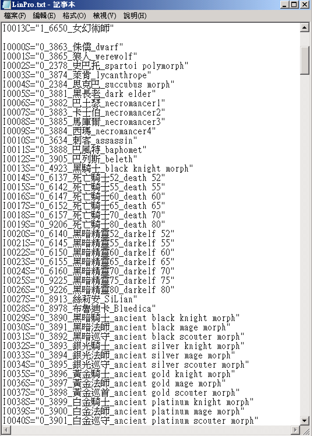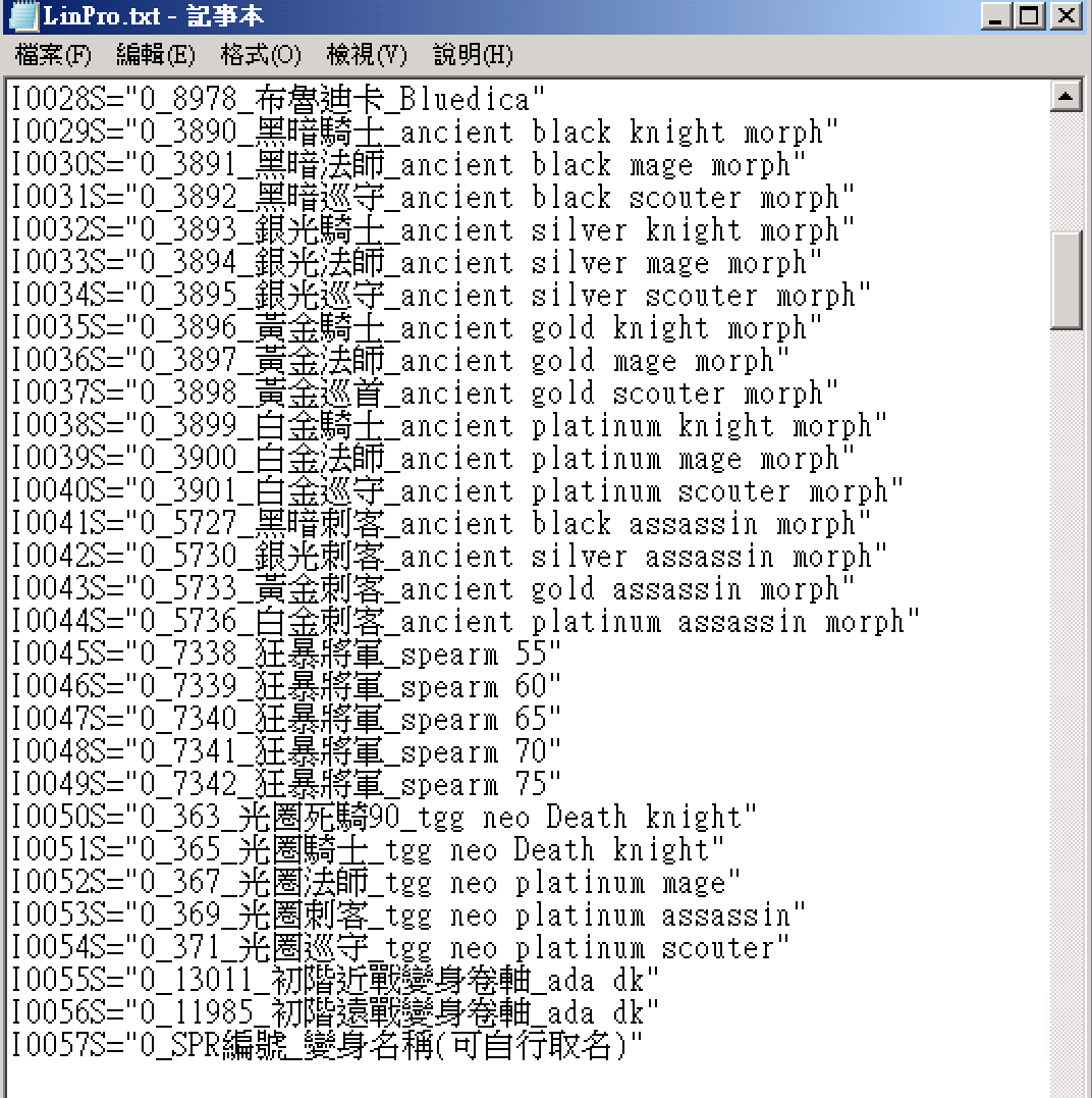 打開LinPRO.txt會看到以下目前所支援的變身項目